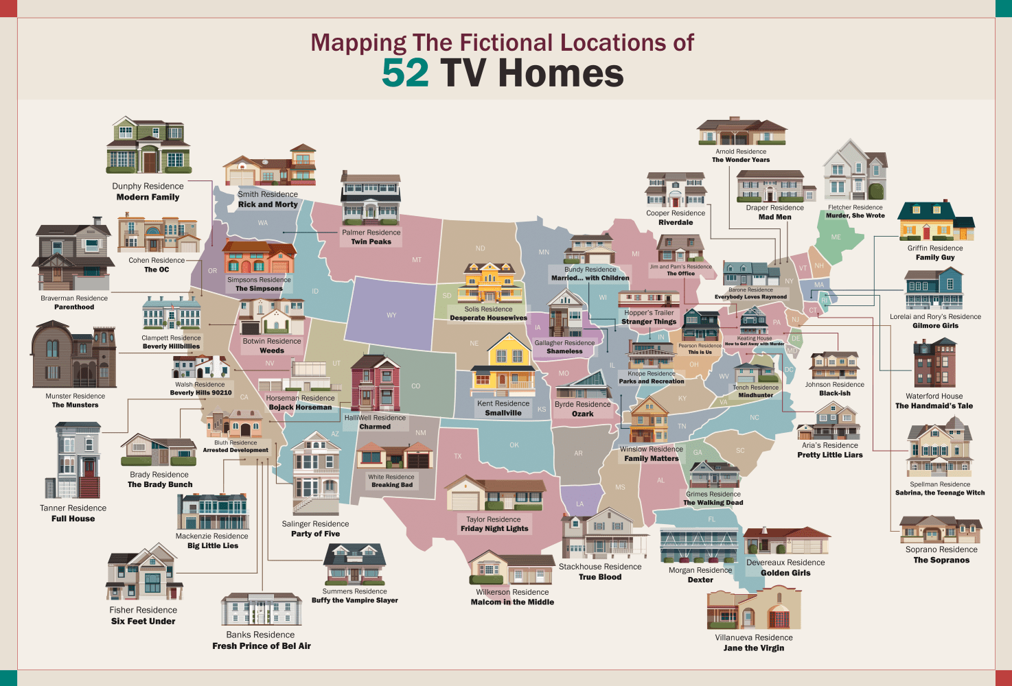 Part of the reason why we love TV shows is because in each episode, we feel at home. Returning to familiar homes feels comforting, however far away the residence may be! This awesome map from HomeAdvisor shows you just where exactly all of our favorite TV houses are supposed to be, from classics like Murder, She Wrote to modern favorites like Big Little Lies. Click the map below for a close-up and a detailed breakdown.
