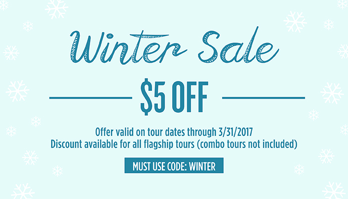 Must use code WINTER during the purchase process. Offer valid on travel/tour dates through March 31, 2017.
